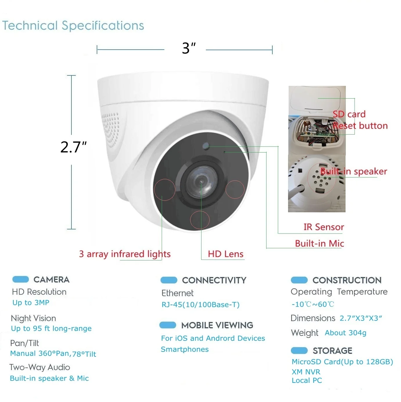3) Clear Night Vision: This XM-JPER3-P ip camera equipped with 3 Array lights IR led lights provides as clear night pictures as daytime. Automaticlly switch to night vision when it's dark which ensure your property is protected even when it’s dark.