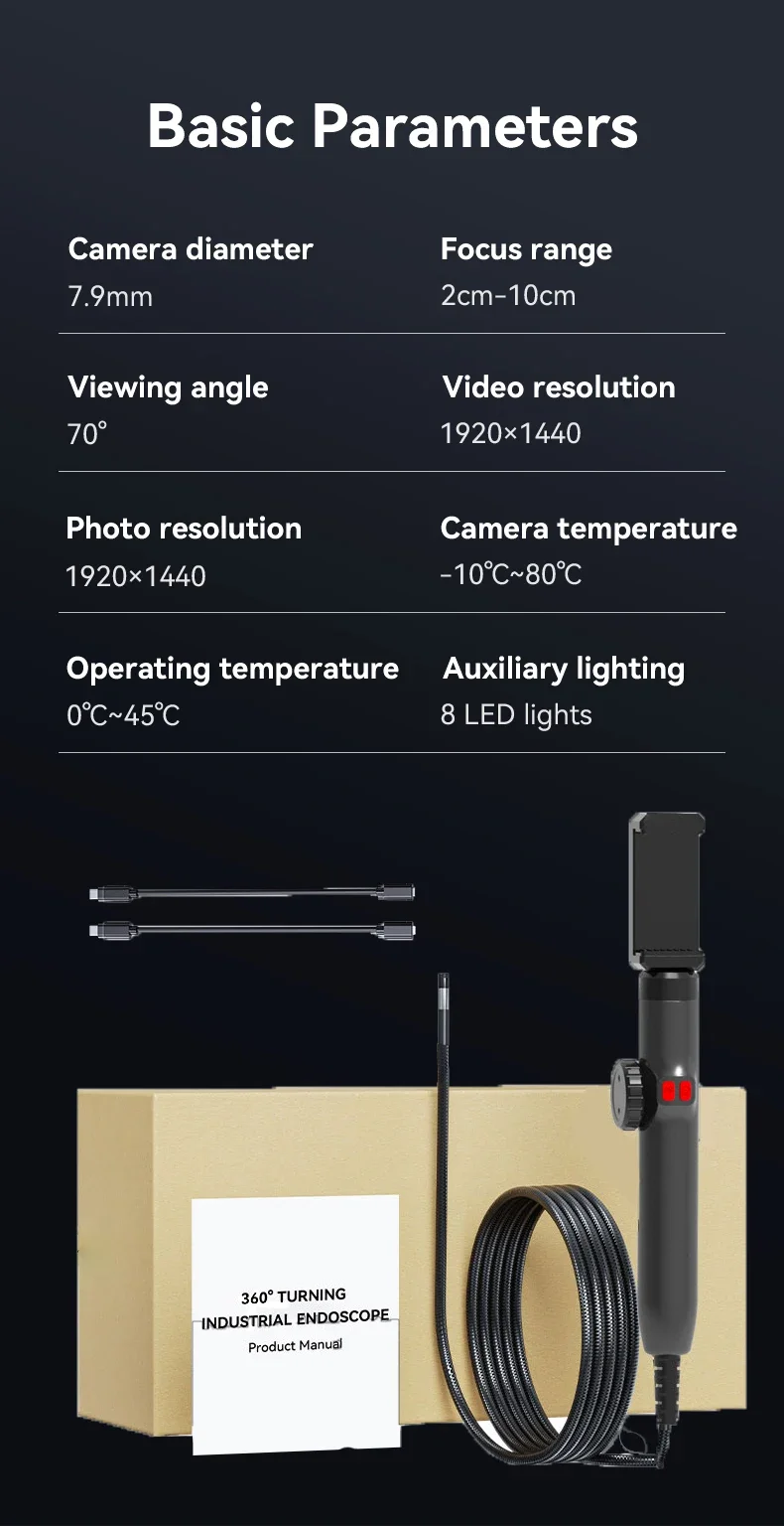 Endoscope articulé bidirectionnel avec lumière, endoscope avec caméra, sonde étanche IP67, téléphone Android et iOS, 360 °, 1080P"