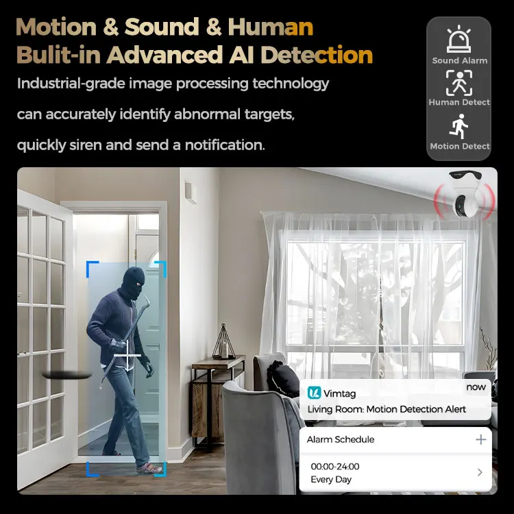 VIMTAG-Caméra de surveillance intérieure PTZ IP WiFi HD 4MP/360 °, dispositif de sécurité sans fil, avec suivi automatique, audio bidirectionnel, vision nocturne infrarouge, IA et détection humaine"