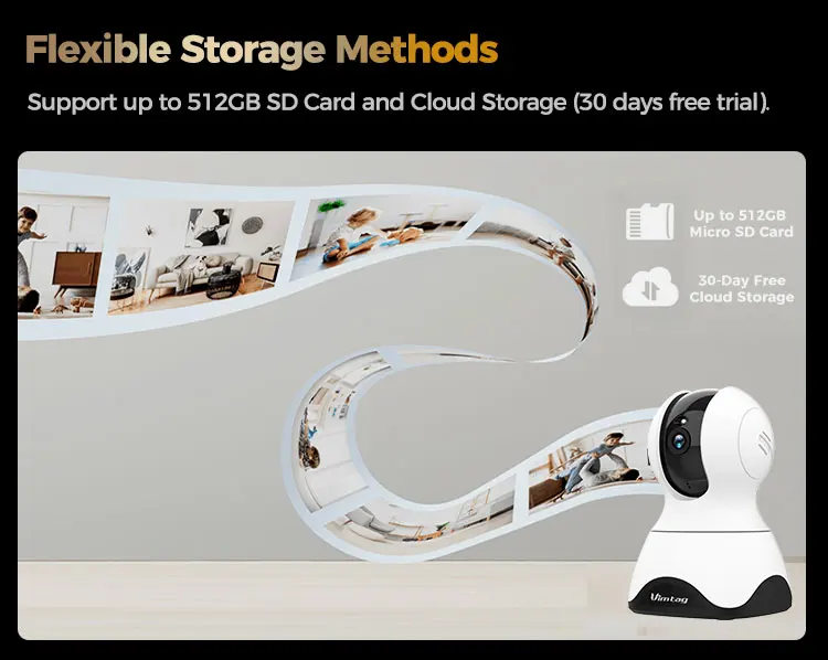 Financial encryption video storage technology enables the security camera to keep a private recording in the Vimtag cloud, meanwhile you can choose an SD card (up to 512G) to avoid any possible risks, managing 24/7 absolute protection for your family,baby and pets.