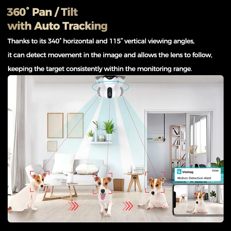The Vimtag camera provides 8X digital zoom, 2.5K/4MP HD crystal clear smooth live video with 360° horizontal and 100° vertical rotation range, covering every corner of your home,monitor your pets, baby all the time .