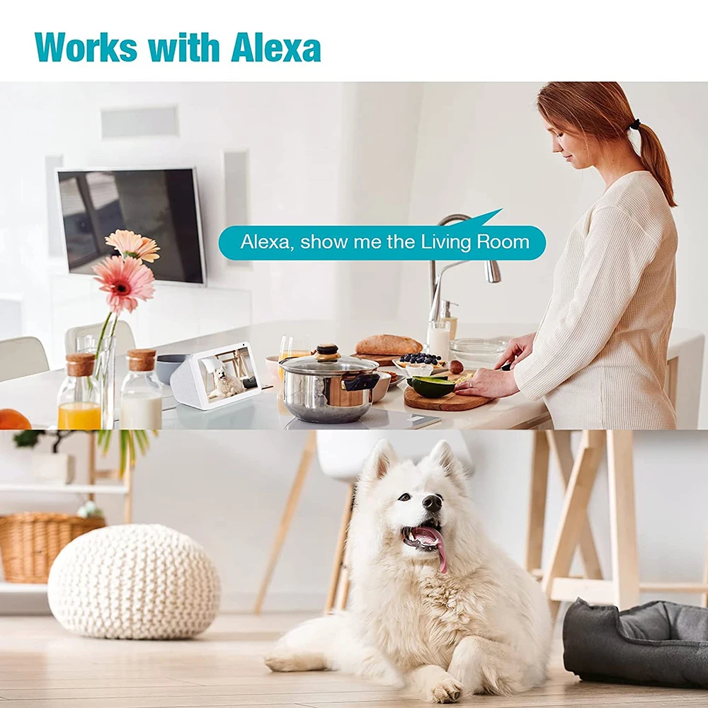 The pet cam built-in microphone & speaker, allowing you to keep in touch with your baby while you are out. Works with Alexa, ask Alexa to show your the doorway, living room, or anywhere else you have this dog camera.
