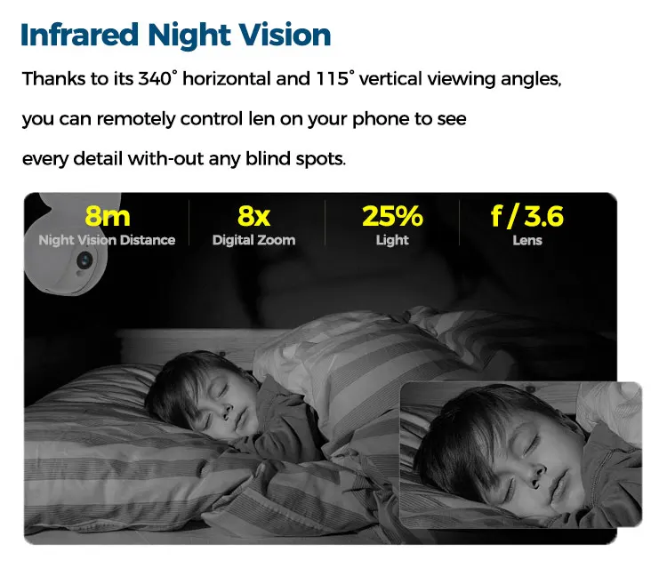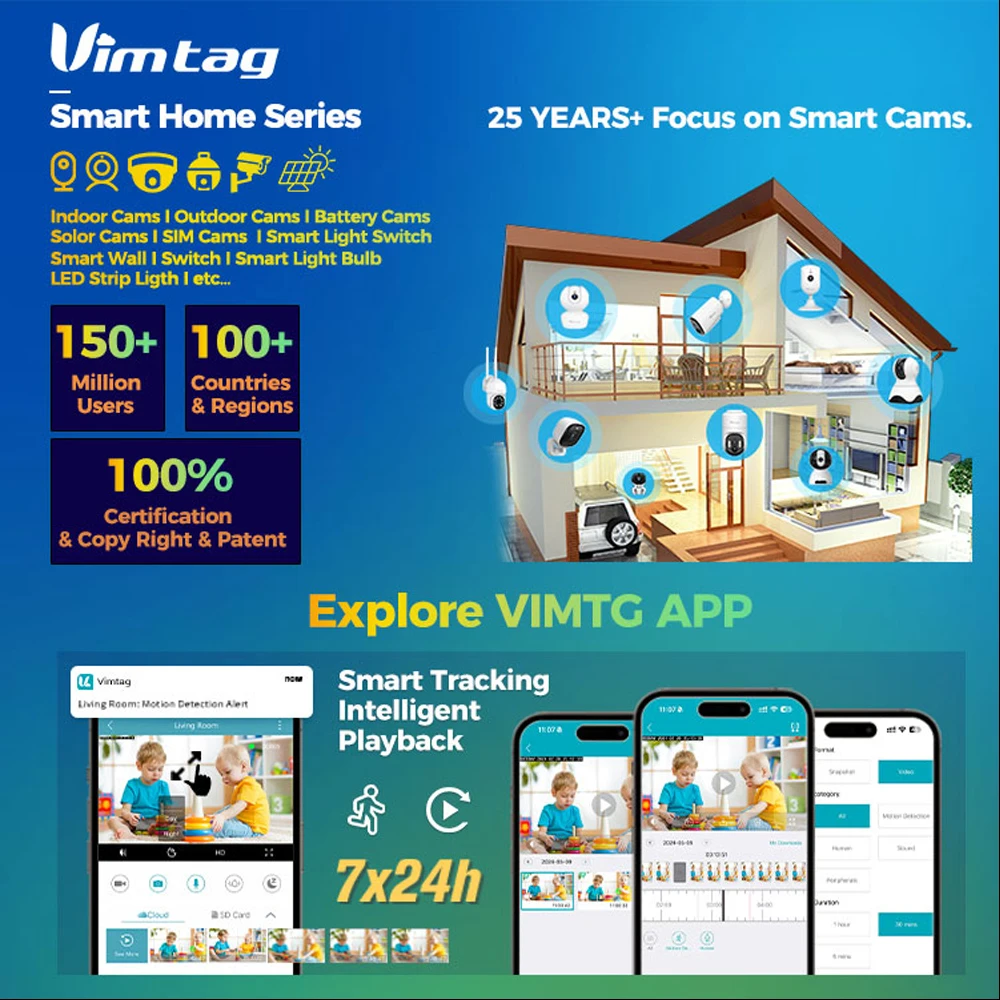 The Vimtag camera provides 8X digital zoom, 2.5K/4MP HD crystal clear smooth live video with 360° horizontal and 100° vertical rotation range, covering every corner of your home,monitor your pets, baby all the time .