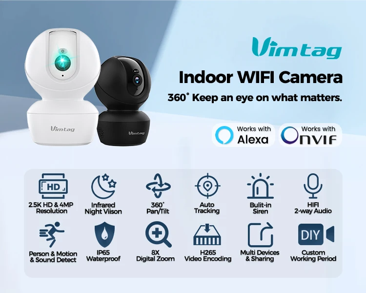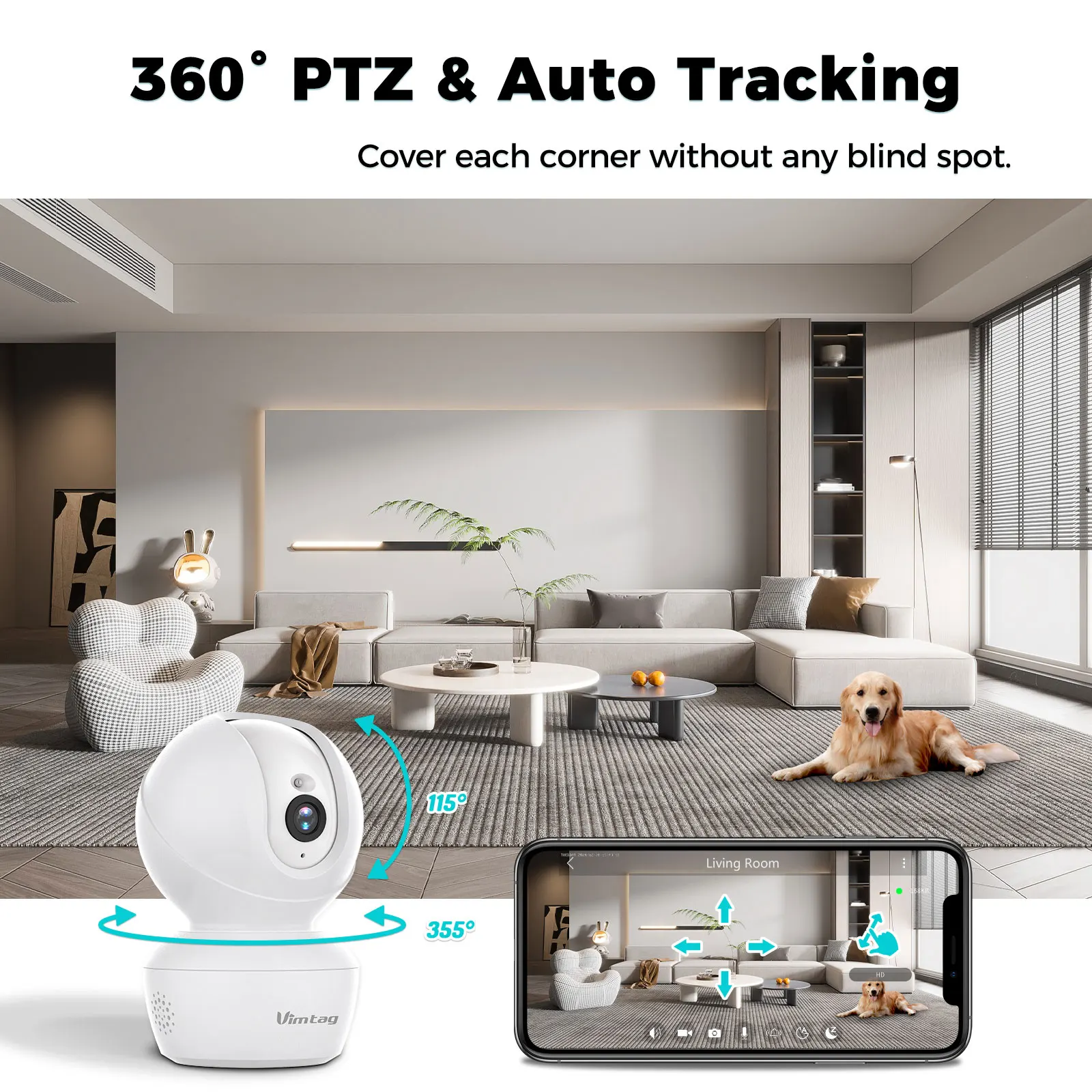 VIMTAG 8211,3.5K CCTV Camera WIFI Indoor Security Camera 360° PTZ ,Auto Tracking with IR Night Vision/2-Way Talk/Human/Sound/Motion Detection/Siren,IP Surveillance Camera for Home/Baby/Pet,Support Insert Micro SD Card,Works with Alexa & ONVIF