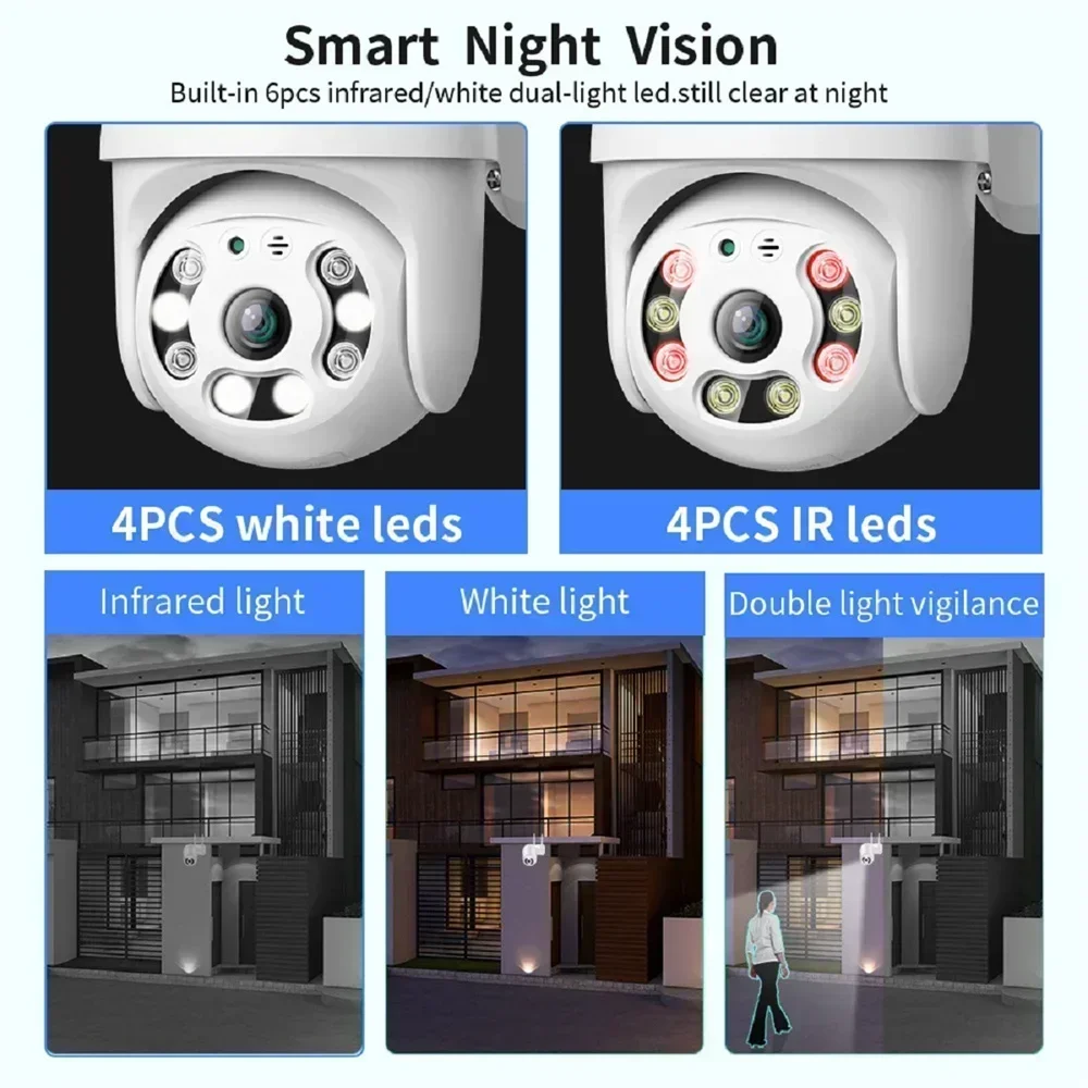 This camera has built-in 4pcs Infrared and 4pcs White LEDS, which can be fully controlled on the mobile phone APP and can switch Among normal Infrared /White light / Double Light Vigilance modes simply and quickly.