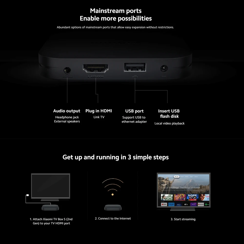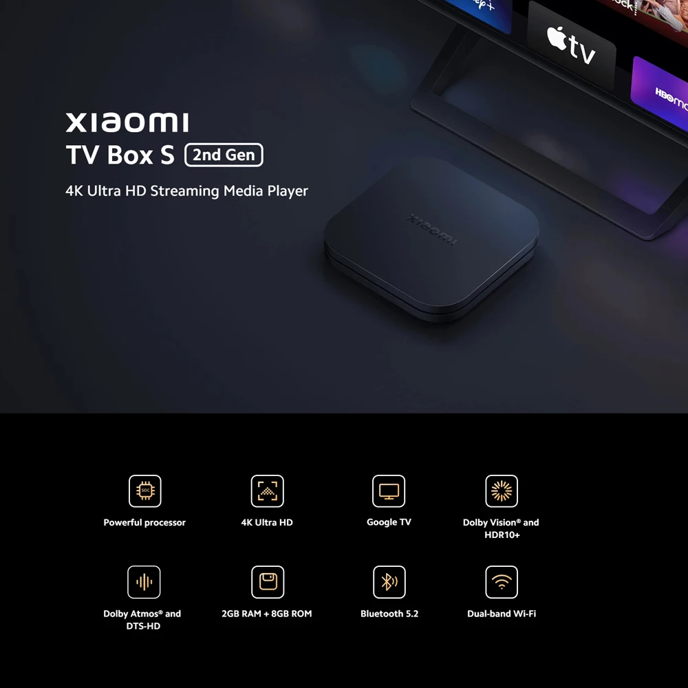 Xiaomi TV Box S 2e génération Mi Box 4K Ultra HD 2GB RAM + 8GB ROM Bluetooth IR télécommande Android Google TV Google AssistantXiaomi TV Box S 2e génération Mi Box 4K Ultra HD 2GB RAM + 8GB ROM Bluetooth IR télécommande Android Google TV Google Assistant