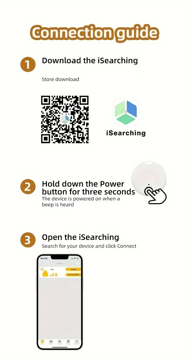 【Compatibility】When you disconnect the anti-lost device on your phone, you can check the map location; Support iOS system and Android 4.3 or later (Bluetooth 4.0 required). You can download the "iSearching" app from the app store, or scan the QR code that comes with the manual to download the software.