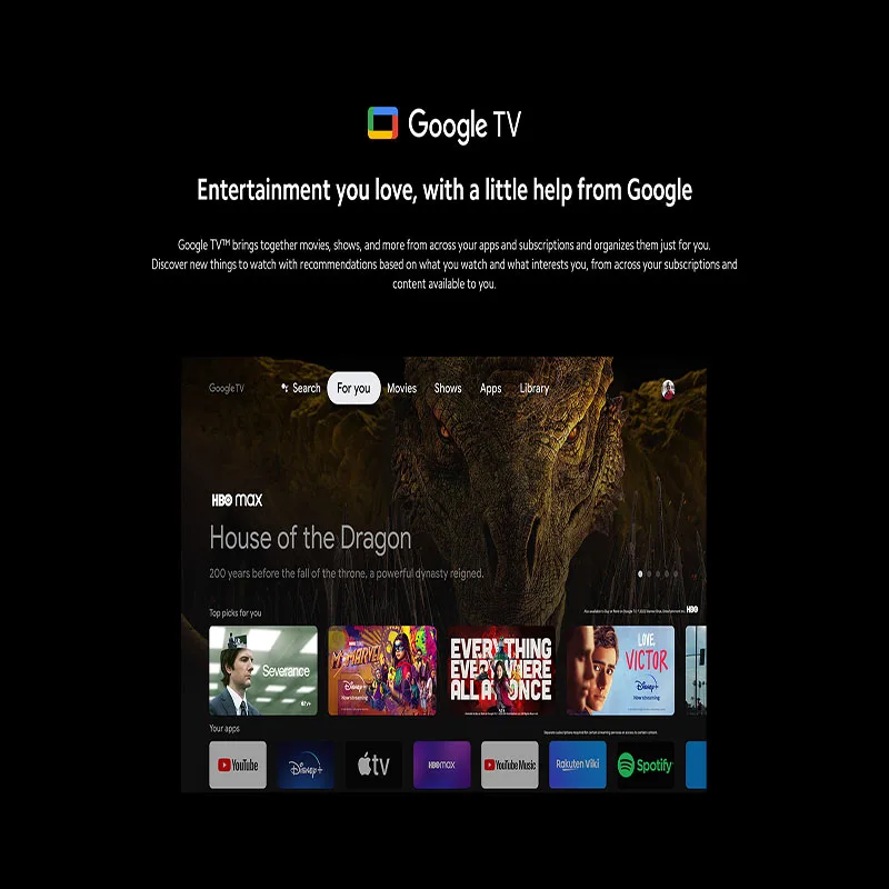 Powerful processor丨4K Ultra HD丨Google TV丨Dolby Vision® and HDR10+丨Dolby Atmos® and DTS-HD丨2GB RAM + 8GB ROM丨Bluetooth 5.2丨Dual-band Wi-Fi