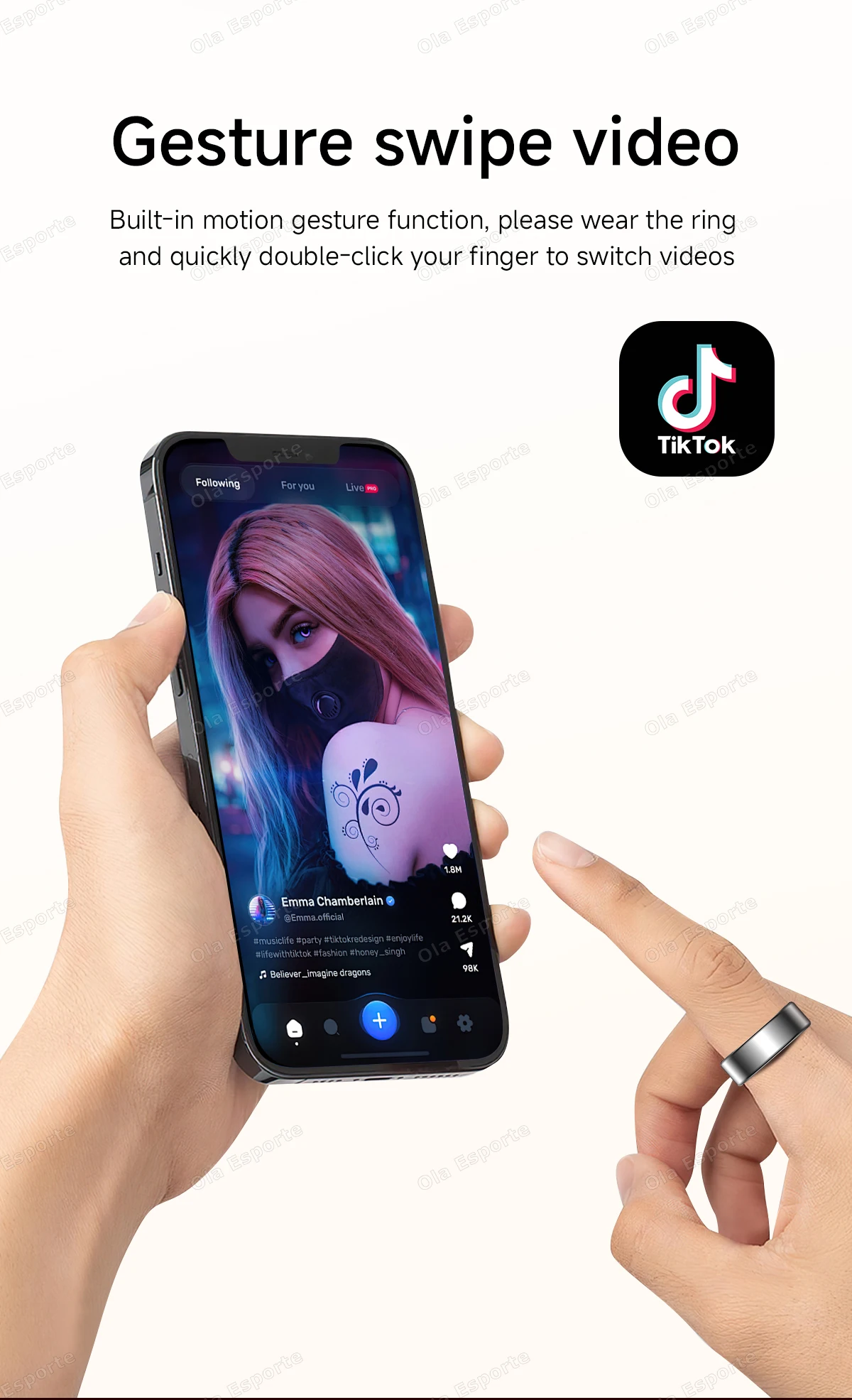 8.Hand gestures brush tiktok: Smart ring brush Tiktok is a new interactive way. Through the connection with the mobile phone or other devices and specific technical support, the ola esporte smart ring can realize some operation control and page turning of the Tiktok application, which provides users with a more convenient and innovative experience. Without directly touching the mobile phone screen, it can operate Tiktok, various videos, browse the web, shop, etc. to a certain extent.
