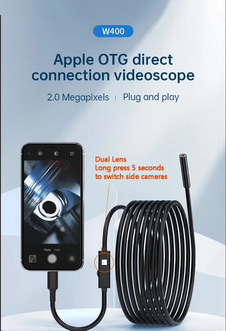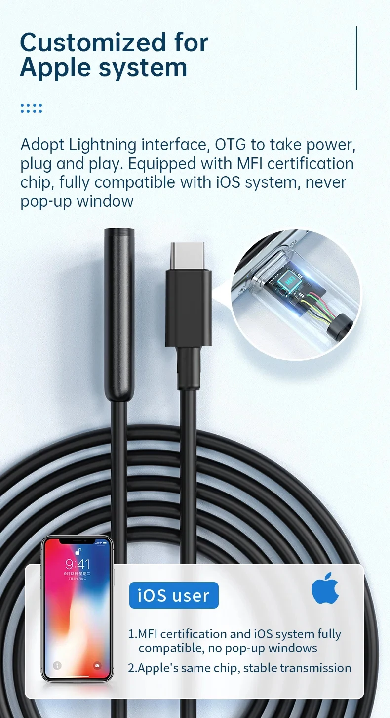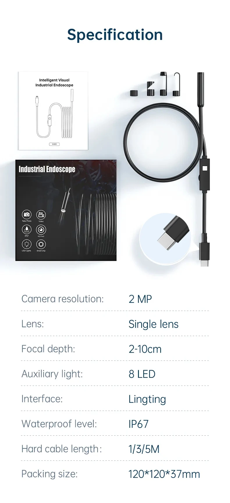 INSKAM-Caméra endoscopique 2MP IP67, étanche, 8mm, boroscope d'inspection de pipeline à fil dur avec 8 LED réglables pour type C et IOS"