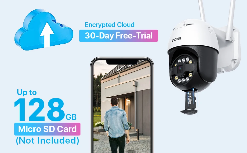 Save videos locally with a micro SD card (up to 128GB) or backup important moments to the encrypted cloud for double insurance.