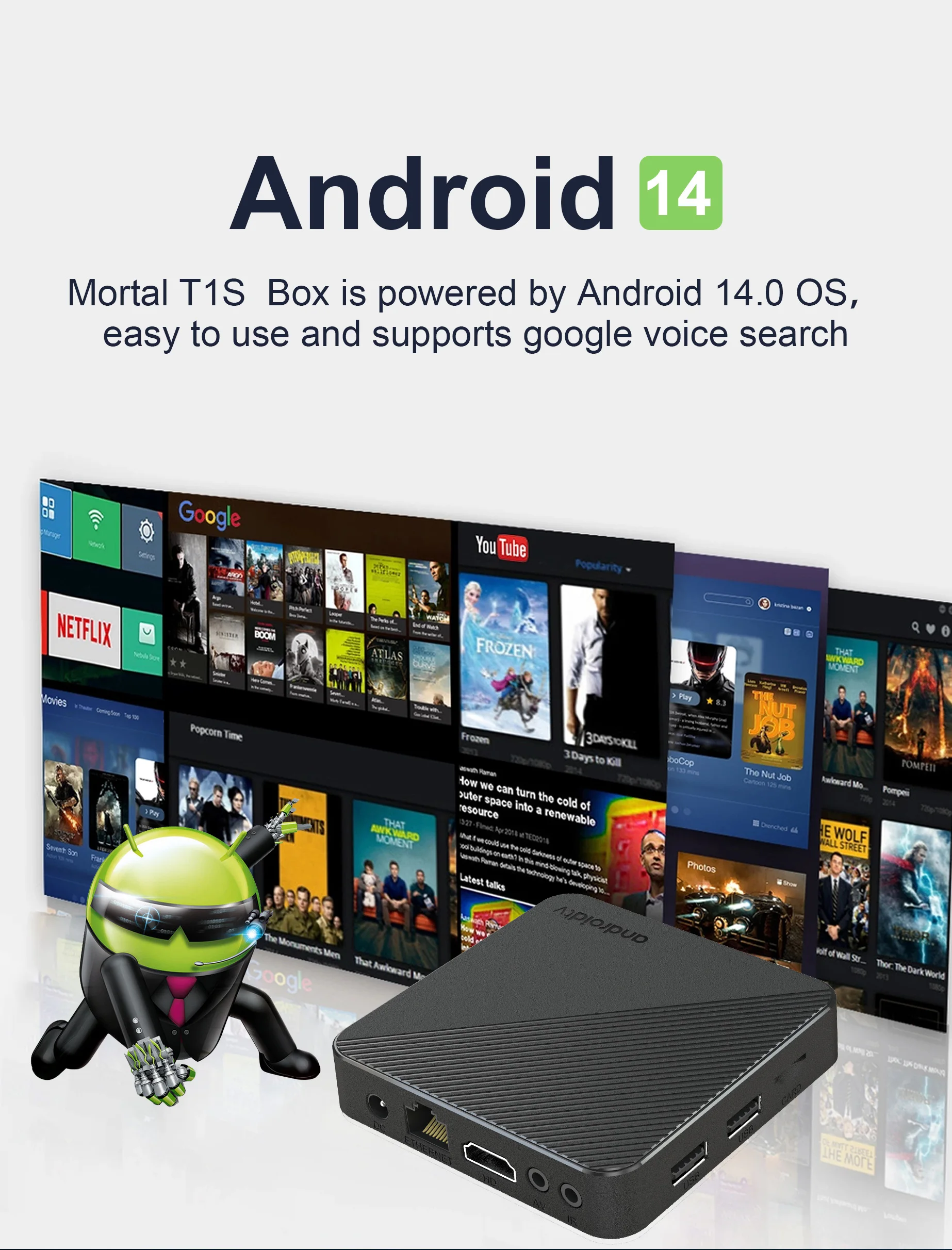 【Android 14】:This TV box uses Android14.0 system, Enjoy a Netflix 4K streaming experience, downloadable games via Play store, ideal for home entertainment and movie-like viewing.