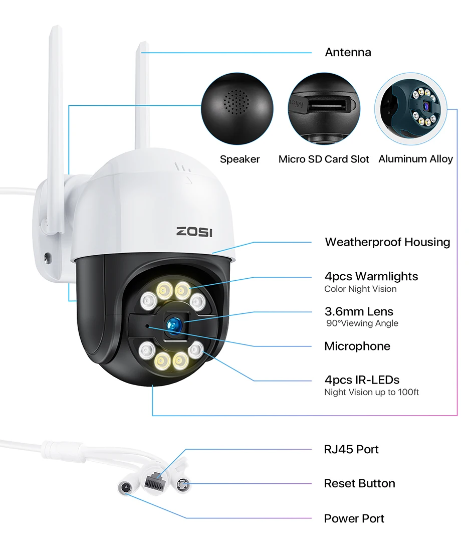 ZOSI-Caméra de surveillance extérieure PTZ IP WiFi HD 2MP/3MP/4MP, dispositif de sécurité sans fil,