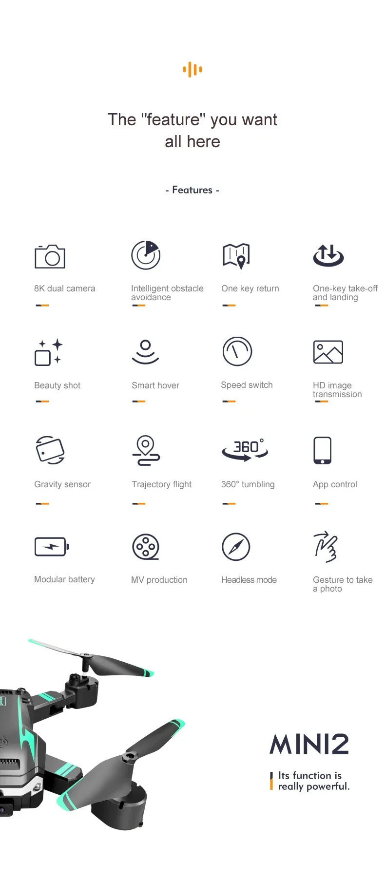 Up/down, forward/backward, left/right, lateral flight, 3 flight speed levels, LED lights, follow, surround flight, waypoint flight, altitude hold mode, headless mode , one button return, one button take off/landing, WiFi FPV, camera/video