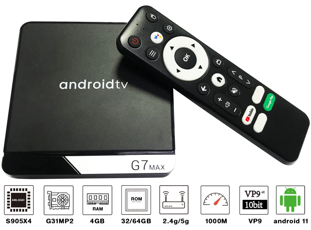 The G7MAX Android 11 TV box supports 4K AV1, bringing 50% more efficient than H.264, and 20% more efficient than HEVC.
