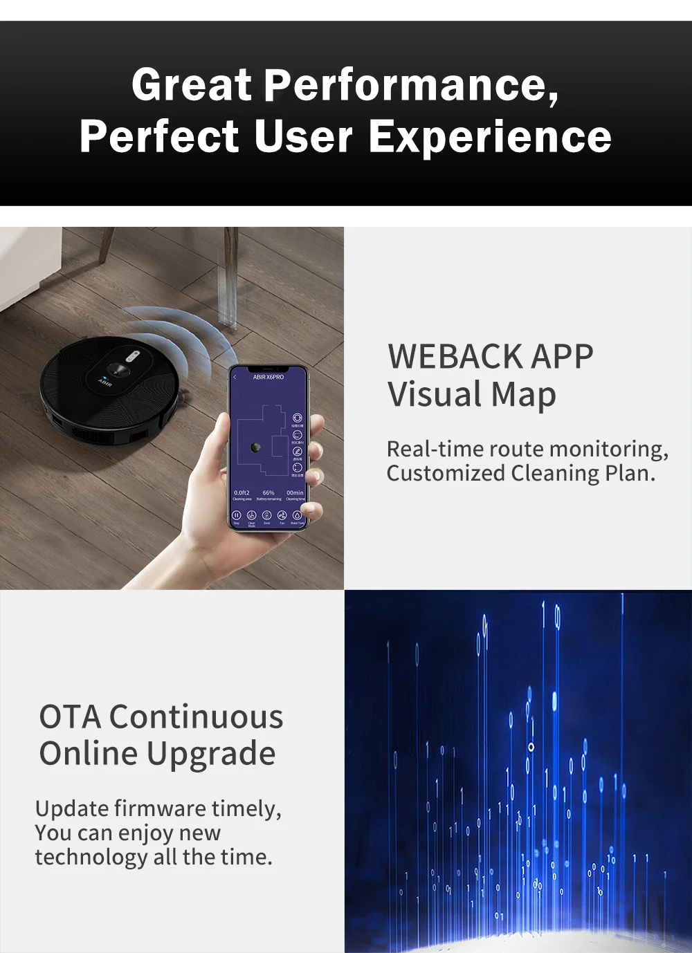 (code promo: CNYFR12) Aspirateur robot ABIR X6PRO avec système oculaire intelligent, aspiration 6000pa, mur virtuel logiciel, nettoyage de zone, désinfection par nettoyage humide, mémoire de carte, compatible avec Alexa, Google Home"